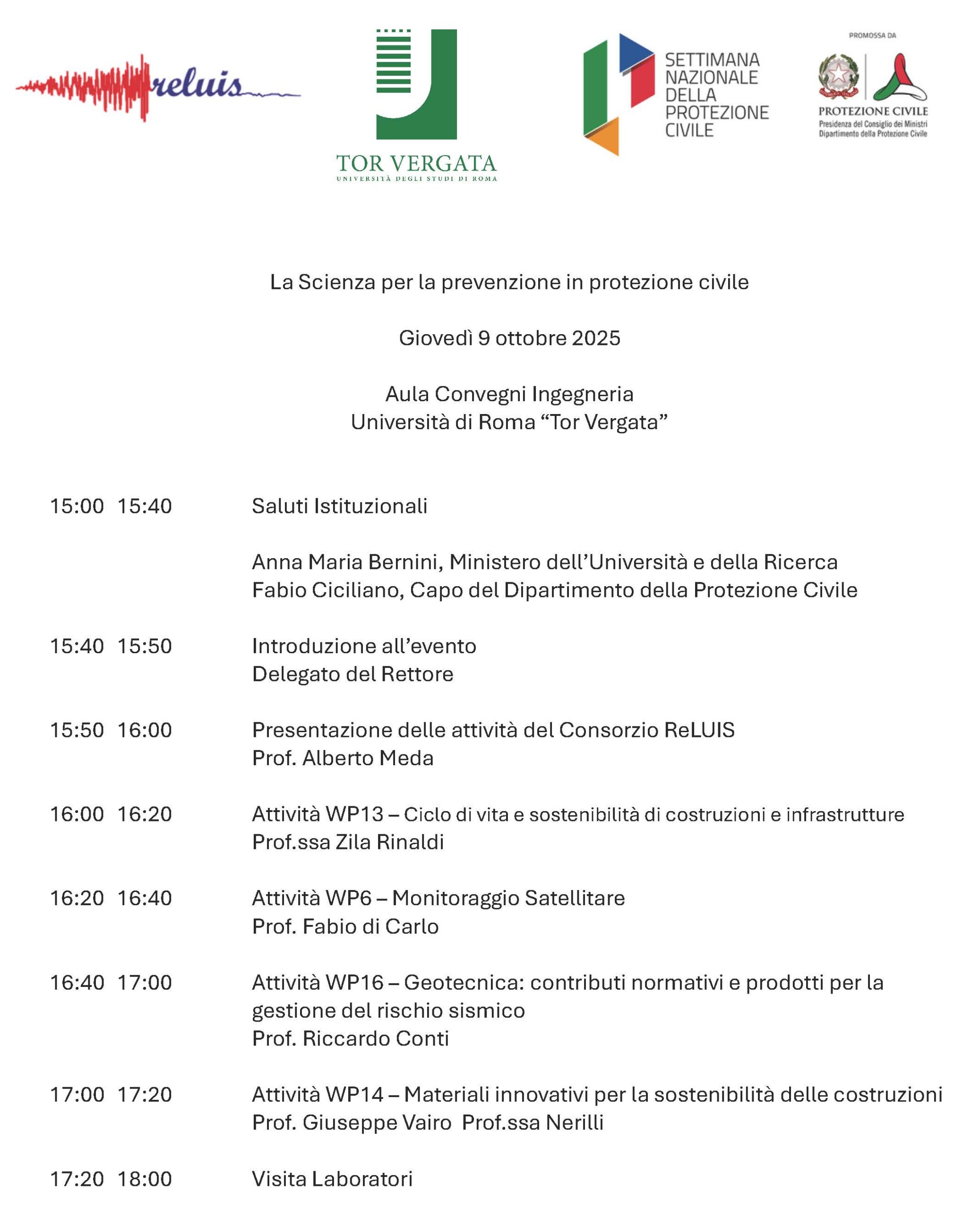 L’evento, organizzato dall’Università Tor Vergata in collaborazione con ReLUIS (Rete dei Laboratori Universitari di Ingegneria Sismica) e con il Dipartimento della Protezione Civile, ha come obiettivo illustrare le principali attività svolte nell’ambito del Consorzio ReLUIS per la prevenzione del rischio sismico.