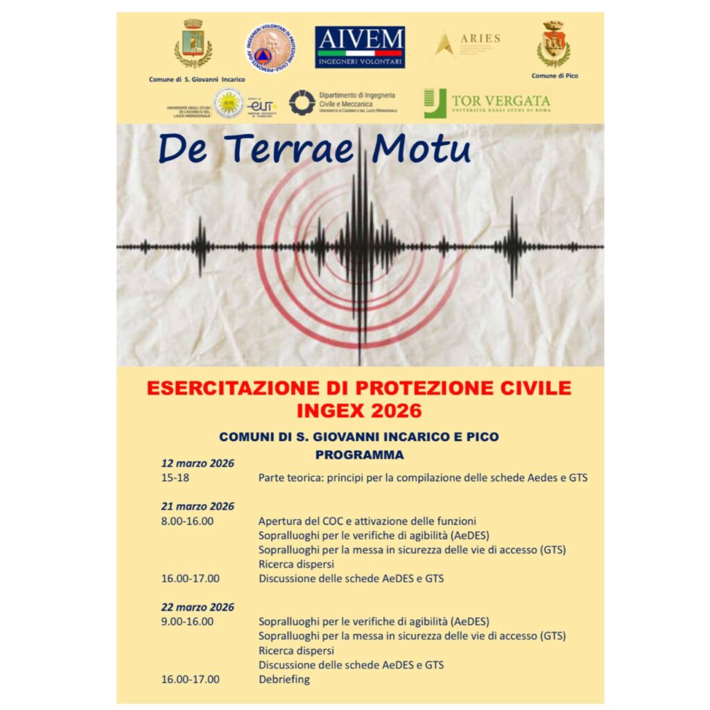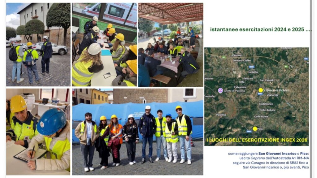 Vi segnaliamo l’organizzazione di una esercitazione di Protezione Civile “INGEX2026”, che si svolgerà nelle giornate del 12, 21 e 22 marzo, nei comuni di S. Giovanni Incarico e Pico. In allegato, la locandina provvisoria dell’evento e del materiale relativo alle edizioni passate.