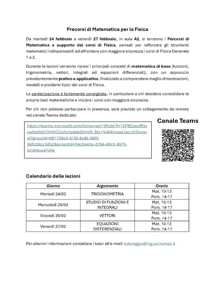 Vi segnaliamo che è stato pubblicato un bando per attività di tutoraggio nell’anno accademico 25-26 a cui possono partecipare studenti iscritti ai corsi di laurea magistrali di ingegneria nell’anno accademico 25-26. Le domande vanno inviate entro il 17/12. Maggiori informazioni al seguente link https://ing.uniroma2.it/2025/12/10/selezione-per-il-conferimento-di-15-assegni-per-attivita-di-tutorato-e-didattico-integrative-propedeutiche-e-di-recupero-a-a-2025-26/