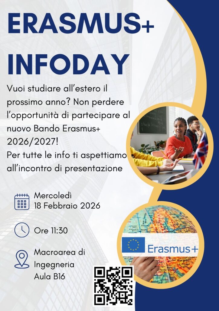 mercoledì 18 febbraio 2026, alle ore 11:30 in aula B16, si terra’ un incontro informativo sul Bando Erasmus 2026/27, che si chiuderà il 2 marzo,