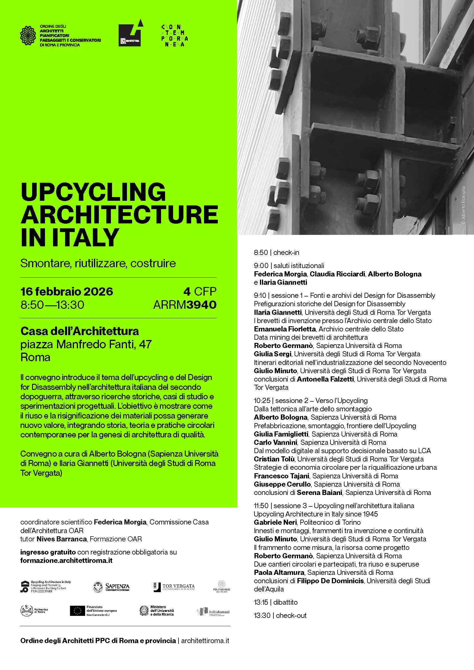 Per la partecipazione al seminario e la redazione di una relazione sono riconosciuti 0,5 cfu agli studenti dei Corsi di: Laurea in Ingegneria dell’Edilizia; Laurea Magistrale in Ingegneria e Tecniche del Costruire; Laurea Magistrale in Ingegneria Edile Architettura.